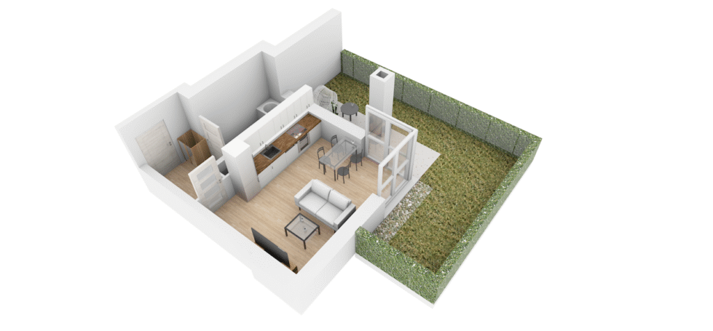 Mieszkanie M-02 to 28.83 m² możliwości na parterze – idealne dla tych, którzy cenią wygodę i bezpośredni kontakt z zielenią. Przestronne pokoje, jasny salon połączony z nowoczesnym aneksem kuchennym oraz prywatny ogródek, w którym poranną kawę wypijesz w otoczeniu kwiatów, a letnie wieczory spędzisz na grillowaniu z najbliższymi.