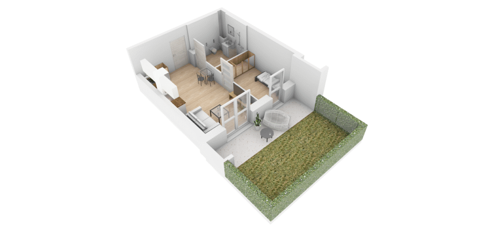 Mieszkanie M-04 to 35.67 m² możliwości na parterze – idealne dla tych, którzy cenią wygodę i bezpośredni kontakt z zielenią. Przestronne pokoje, jasny salon połączony z nowoczesnym aneksem kuchennym oraz prywatny ogródek, w którym poranną kawę wypijesz w otoczeniu kwiatów, a letnie wieczory spędzisz na grillowaniu z najbliższymi.