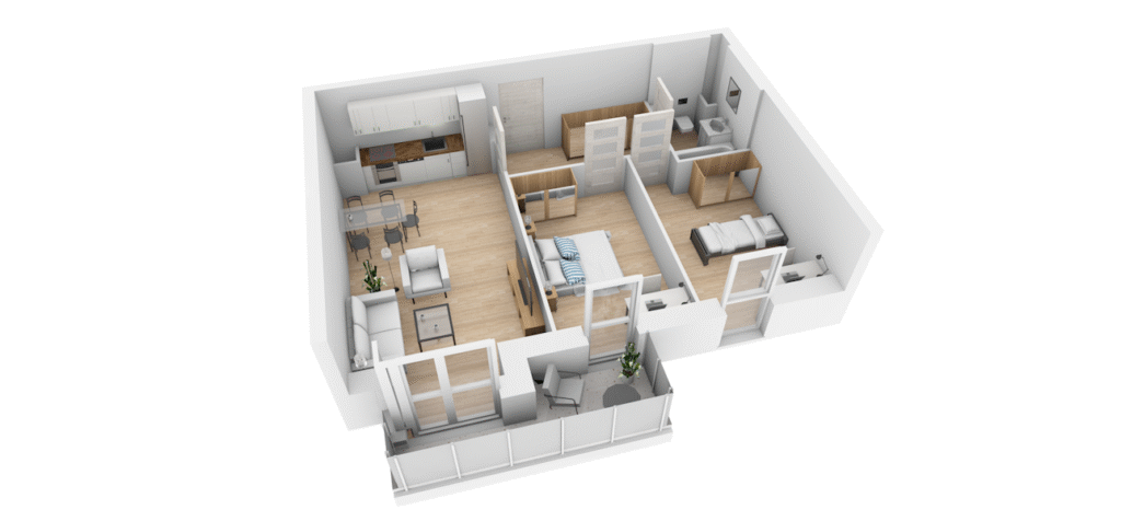Mieszkanie M-13 to 55,59 m² możliwości na pierwszym piętrze – idealne dla tych, którzy cenią wygodę i dostęp do światła naturalnego, bez hałasu z poziomu gruntu. Funkcjonalne pokoje, jasny salon połączony z nowoczesnym aneksem kuchennym oraz dodatkowy balkon lub taras, gdzie poranną kawę wypijesz, ciesząc się spokojnym widokiem na okolicę, a wieczory spędzisz na rozglądaniu się po pięknie oświetlonej przestrzeni.
