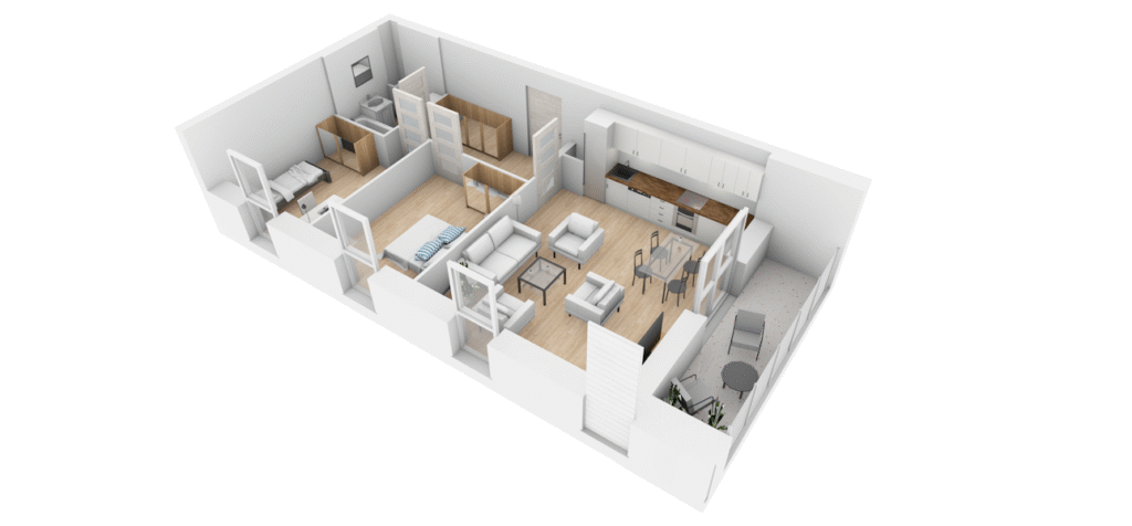 Mieszkanie M-21 to 56.87 m² możliwości na pierwszym piętrze – idealne dla tych, którzy cenią wygodę i dostęp do światła naturalnego, bez hałasu z poziomu gruntu. Funkcjonalne pokoje, jasny salon połączony z nowoczesnym aneksem kuchennym oraz dodatkowy balkon lub taras, gdzie poranną kawę wypijesz, ciesząc się spokojnym widokiem na okolicę, a wieczory spędzisz na rozglądaniu się po pięknie oświetlonej przestrzeni.