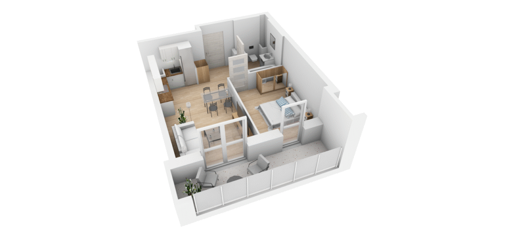 Mieszkanie M-42 to 34.50 m² możliwości na pierwszym piętrze – idealne dla tych, którzy cenią wygodę i dostęp do światła naturalnego, bez hałasu z poziomu gruntu. Funkcjonalne pokoje, jasny salon połączony z nowoczesnym aneksem kuchennym oraz dodatkowy balkon lub taras, gdzie poranną kawę wypijesz, ciesząc się spokojnym widokiem na okolicę, a wieczory spędzisz na rozglądaniu się po pięknie oświetlonej przestrzeni.